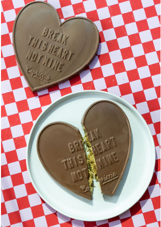 La barra mas viral del momento, ahora en versión corazón. Elaborada con chocolate de leche, kataifi tostado y crema de pistache.